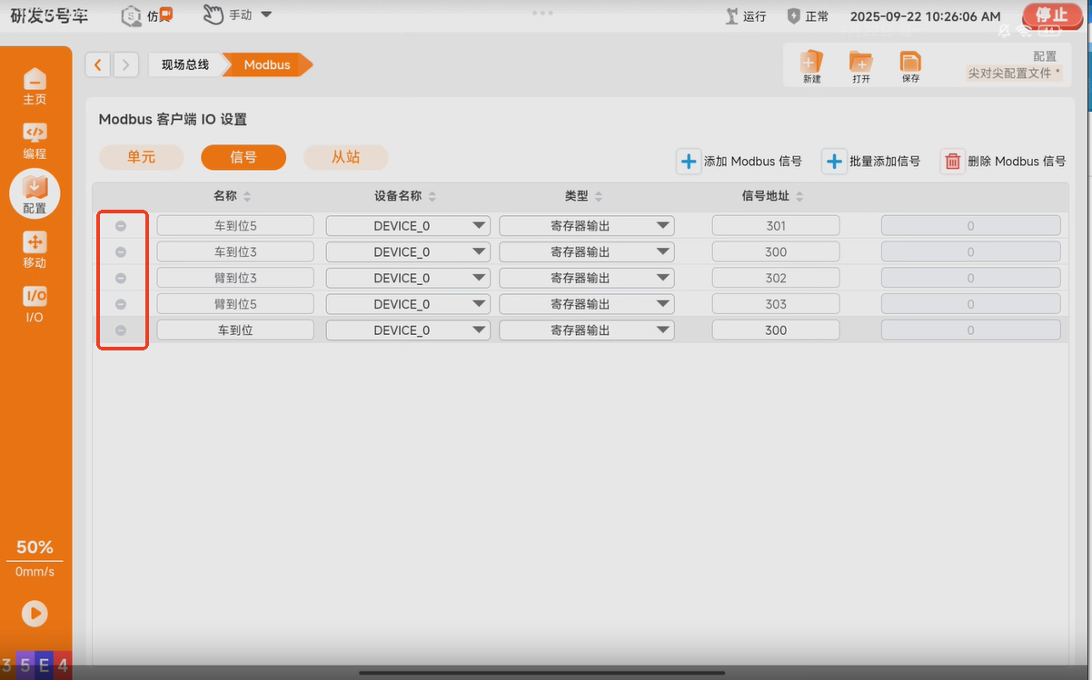 在“配置 -> 现场总线 -> Modbus -> 信号”中添加信号类型为寄存器/数字输入,在“配置 -> 一般 -> I/O”设置可配置其 I/O 输入动作,除拖动示教外其余信号需要在联动模式下触发信号执行(也可通过OEM定制功能使其在手动模式或自动模式生效)