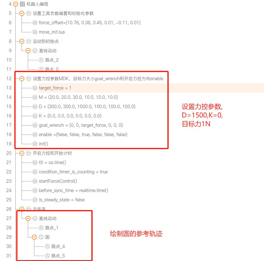 - 第二段,以力平衡点为基准点,在基准点 Z 不变的情况下,设置另外两个参考点,这三个点构成一条圆的轨迹。将设置好的圆的参考轨迹给力控,根据力控反馈的力的值修正圆的轨迹,时刻保持在 1N 左右直到圆形绘制完成。结束条件包括 运动超时、运动到位、力控超出最大力达到保护性停止。
