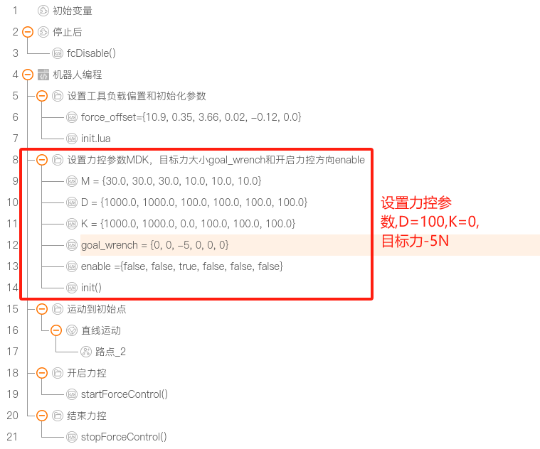 实例说明 : 在实例1演示的拖动中增加目标力 -5N,机械臂会受目标力影响,一直朝着能使目标力平衡的方向移动,直到受到相等的外力使机械臂达到平衡状态,机械臂停止运动。该实例中,目标力为 -5N,机械臂向下运动,直到给工具向上 5N 的外力使之达到平衡状态。