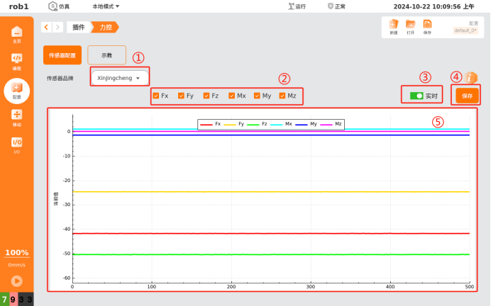 在“配置 > 插件 > 力控 > 传感器”配置界面可以査看实时的力控数据,如下所示,参考坐标系为上面②设置的坐标系。