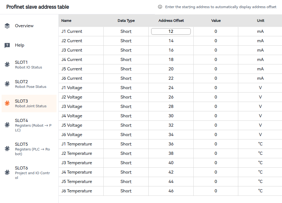 By checking the address table and PLC start address, it is known that the IP address 184 of slot 2, with two bytes, is for accessing the robot status, and the IP address 186 of slot 2 is for accessing the safety status.