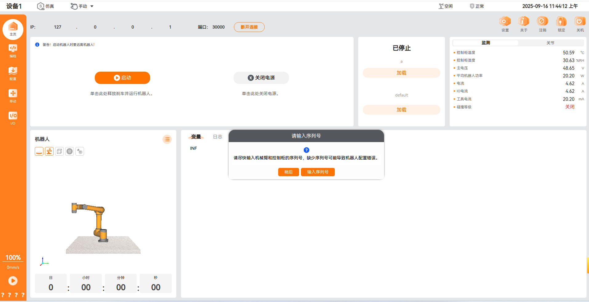 在未写入机械臂序列号时,进行上电会提示缺少机械臂序列号,按照提示进行写入即可
