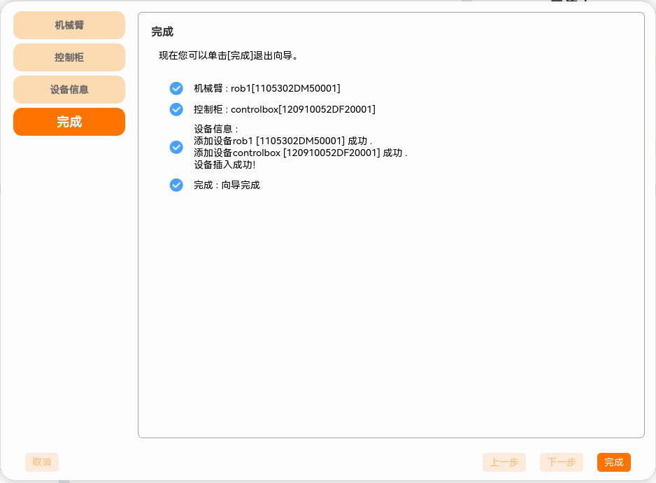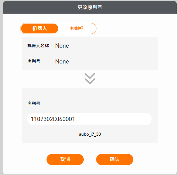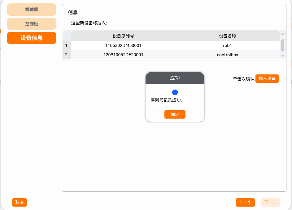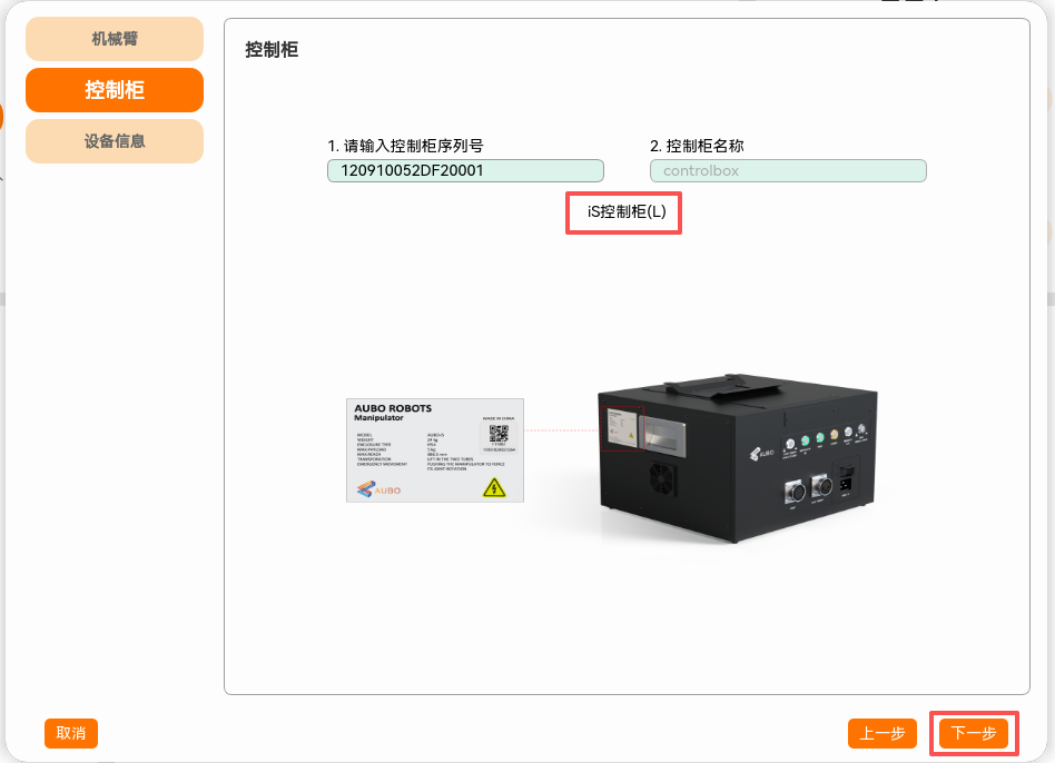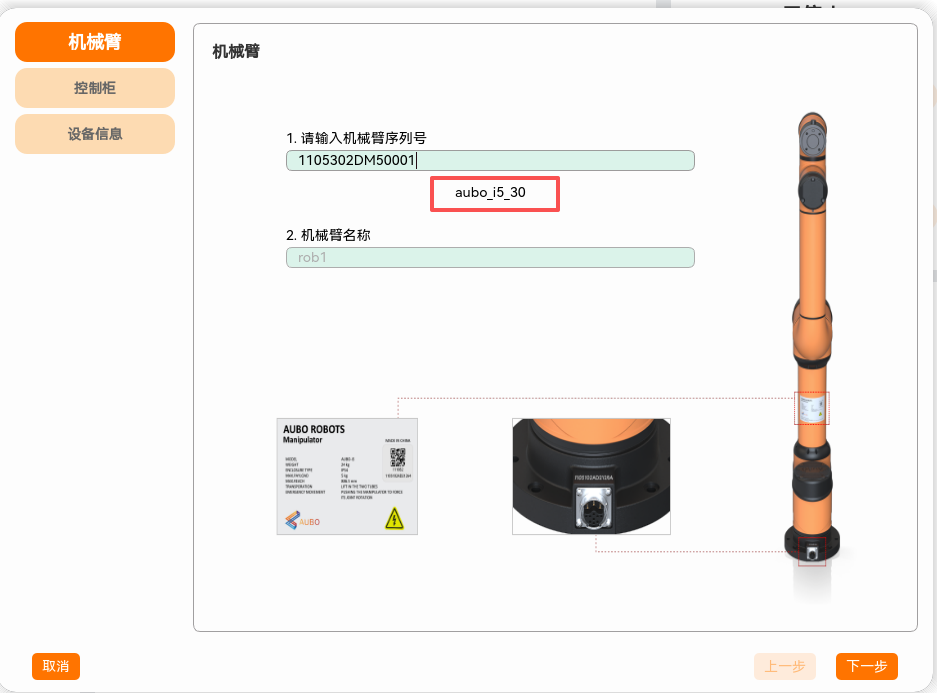 输入机械臂序列号后,下方根据命名规则,显示铭牌型号,与实际型号对比无误后,点击下一步