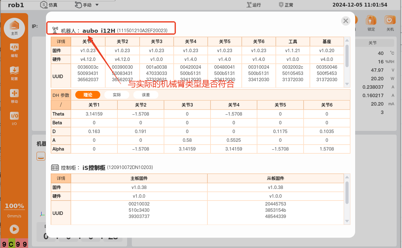 - 写入序列号之后重新进行上电,模型仍然显示不对,请查看机器人详情页,检查输入序列号与机械臂上铭牌是否一致,在确保机械臂序列号一致的情况下查看机器臂型号是否相符
