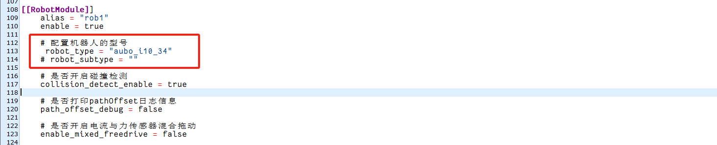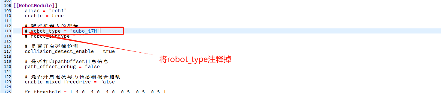 - 查看/root/arcs_ws/config/aubo_control.conf文件是否机械臂型号被强制指定,如出现下图中被强制指定的情况,请将robot_type字段注释掉 保存之后,重新启动aubo_cntrol