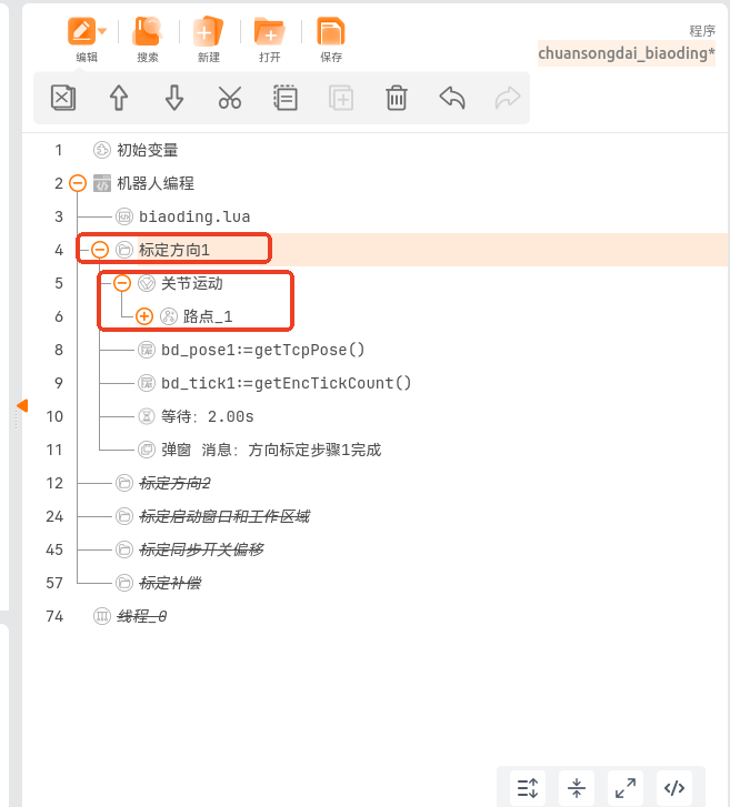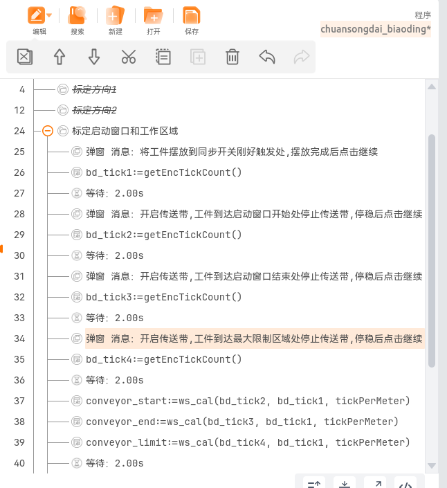 2>将机械臂移动至安全位置,运行传送带使工件移动一段距离后停止传送带(不超过机械臂可达范围),抑制 "标定方向1" ,解除 “标定方向2” ,设置路点0为上次工件上某点,运行工程。此时 传送带的方向(direction) 和 每米脉冲数(tickPerMeter) 即标定完成。