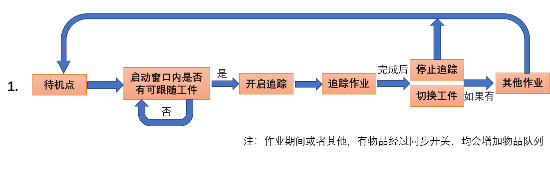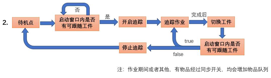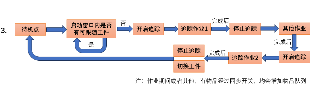 3>如下图中第三个流程图所示,该逻辑适用于机械臂在传送带对工件作业后,脱离传送带进行其他作业,然后对工件进行二次传送带跟随作业,最后返回待机 点。