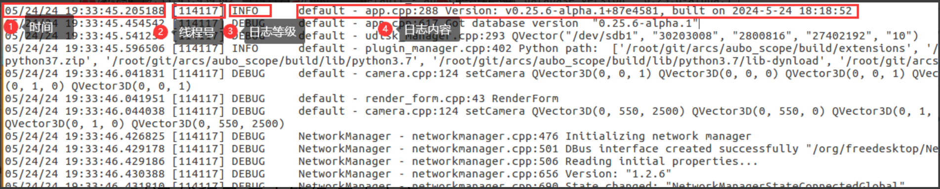 aubo_scope.log 中的日志等级分为:DEBUG-调试、WARNING-警告、ERROR-错误、FATAL-致命、INFO-信息。出现异常情况时主要看 ERROR,其次是 WARNING,FATAL 几乎不会出现。