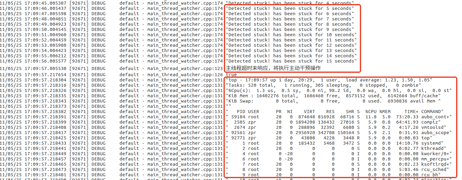 有线示教器发生卡顿时会记录有助于排查卡顿原因的关键信息,如下图所示: